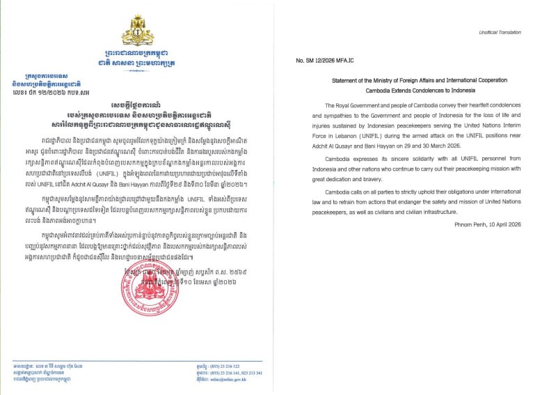 AKP Phnom Penh, April 10, 2026 -- Cambodia has extended its heartfelt condolences to Indonesia following the loss of life and injuries sustained by Indonesian peacekeepers serving under the United Nations Interim Force in Lebanon (UNIFIL). In a statement issued on...