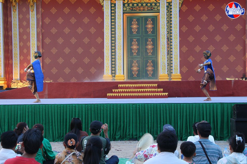 A scene from a Lakhon Khol performance, featuring the “Chambang Indrajit” (Battle of Indrajit), takes place at the Nokor Sankaranta Cultural Village this evening, the final day of the Khmer New Year festival.